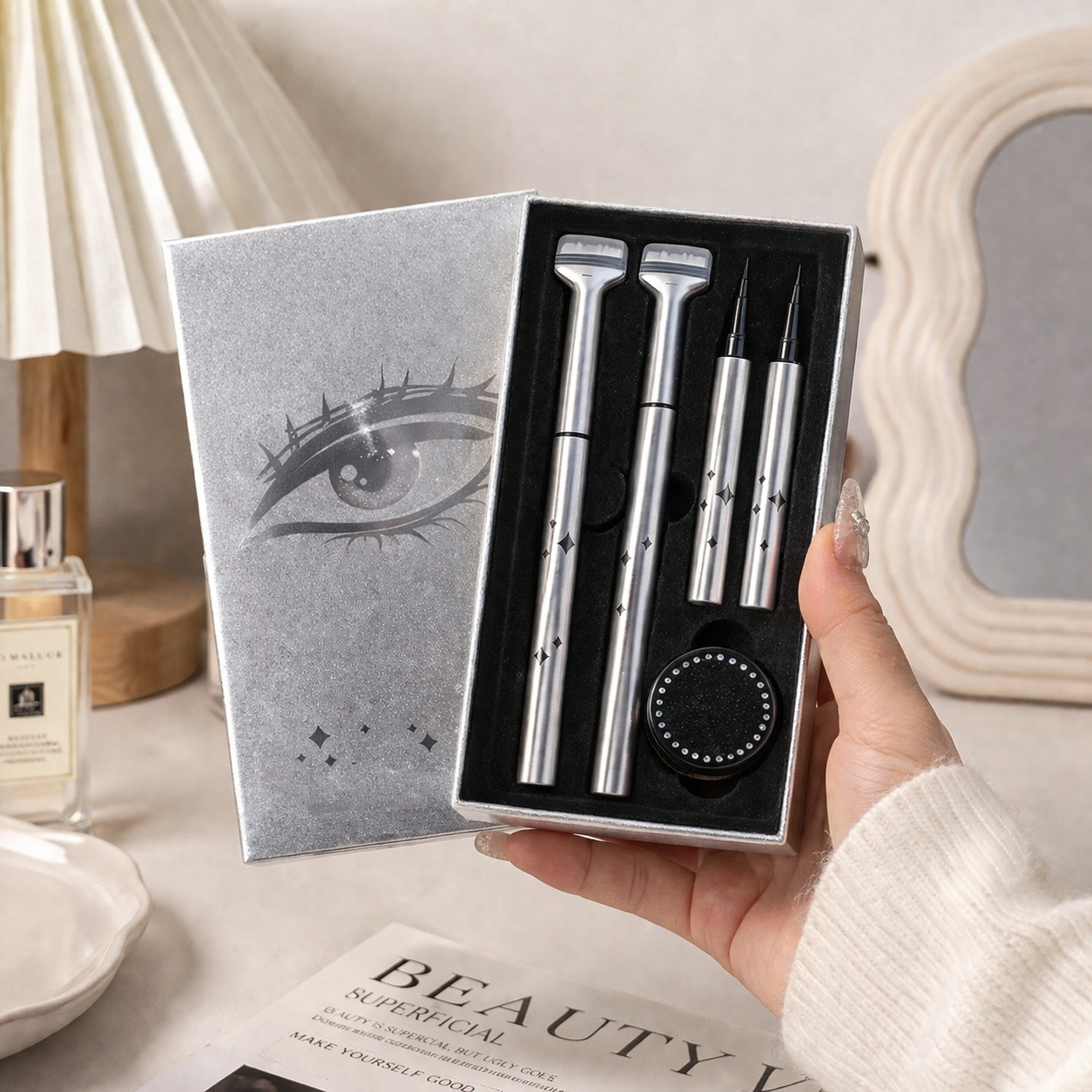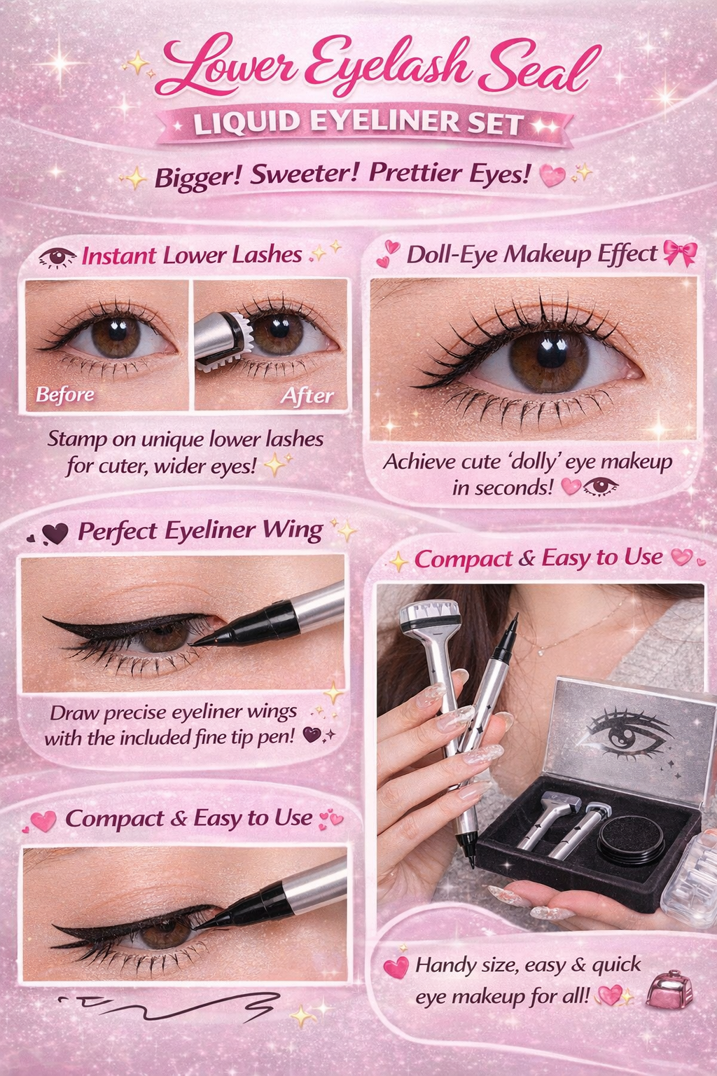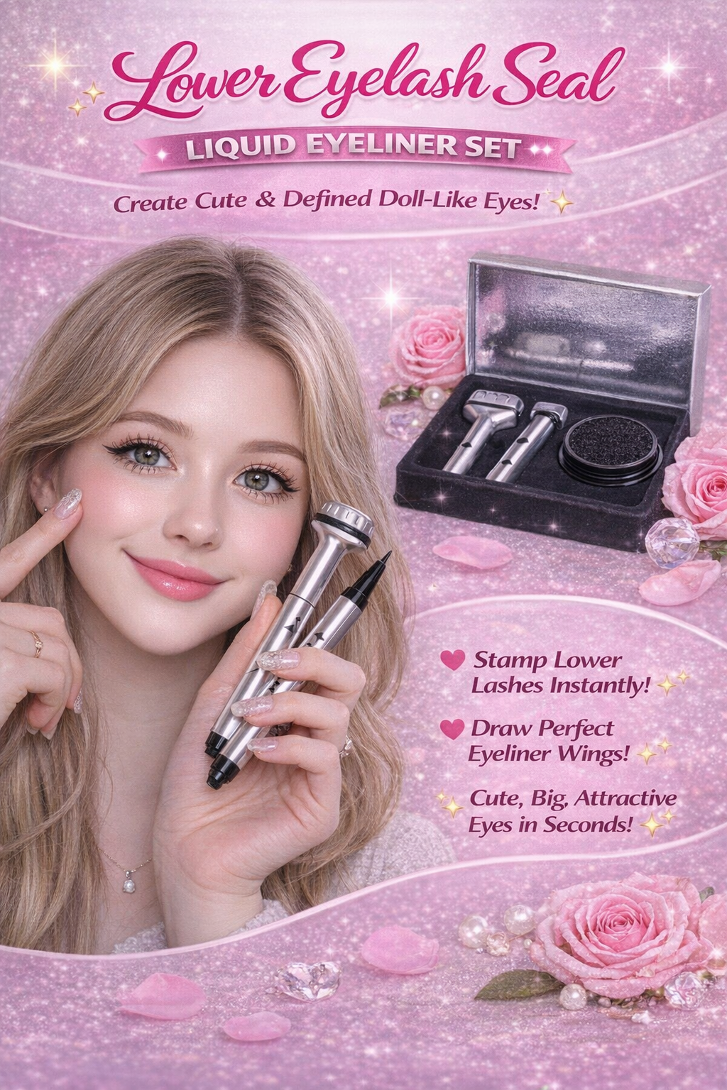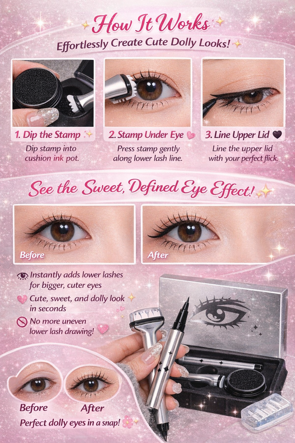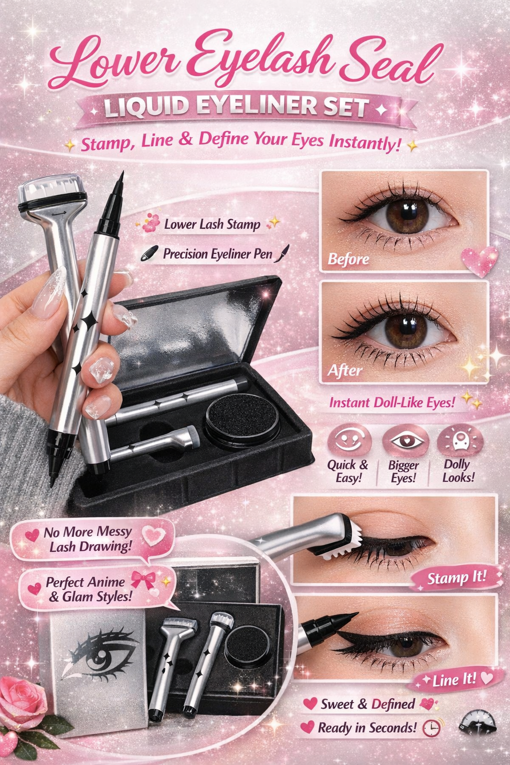 This clever 2-in-1 eyeliner set helps you stamp delicate lower lashes and draw sharp eyeliner with ease — perfect for daily makeup, cute doll-eye looks, or bold anime-inspired styles 🌸🖤